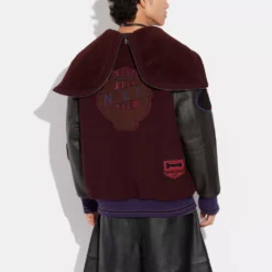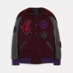 Bring (and wear) your A game. Crafted of recycled wool and recycled polyester, this jacket is part of Coach Forever, a collection inspired by our commitment to rethinking and reducing our impact on the planet. Inspired by vintage letterman jackets, this oversized design features luxe leather details and a zip-up hood. It’s finished with our playful, sporty Varsity patches and striped trim.