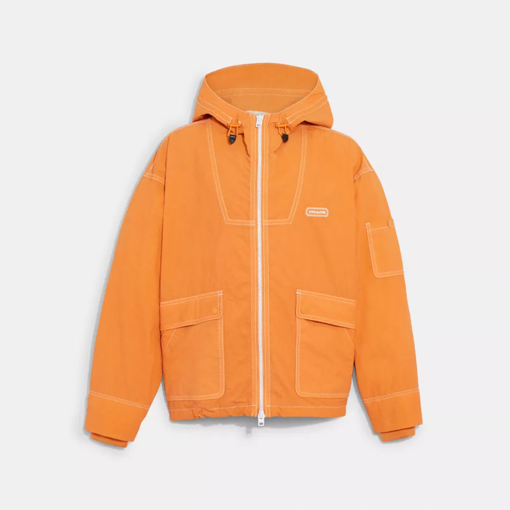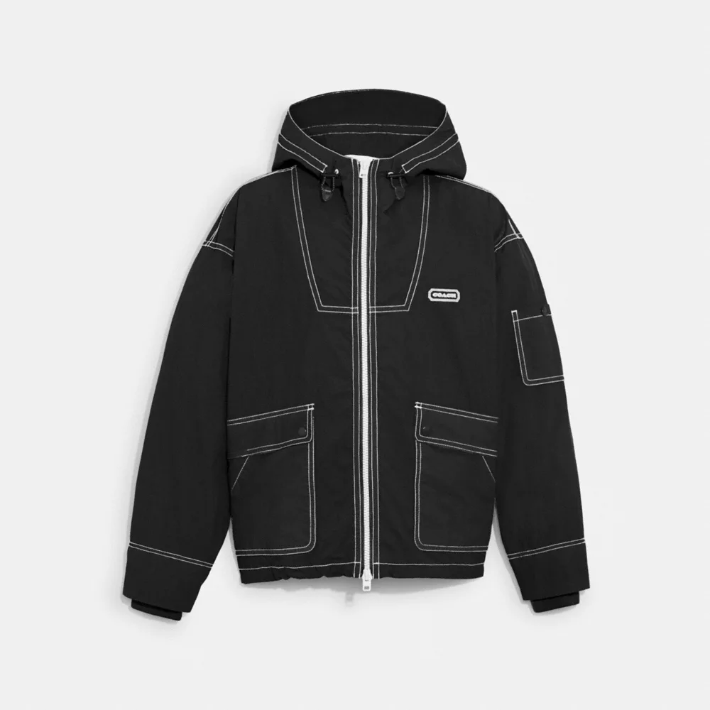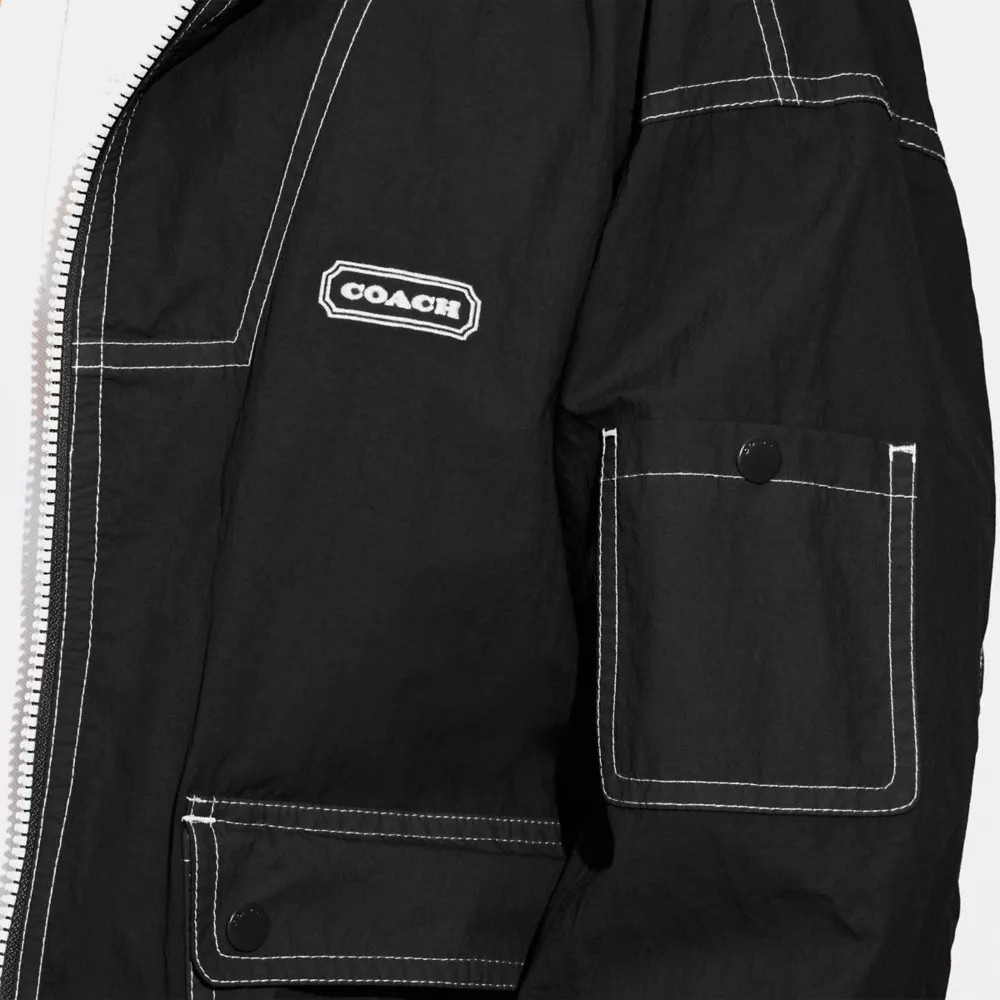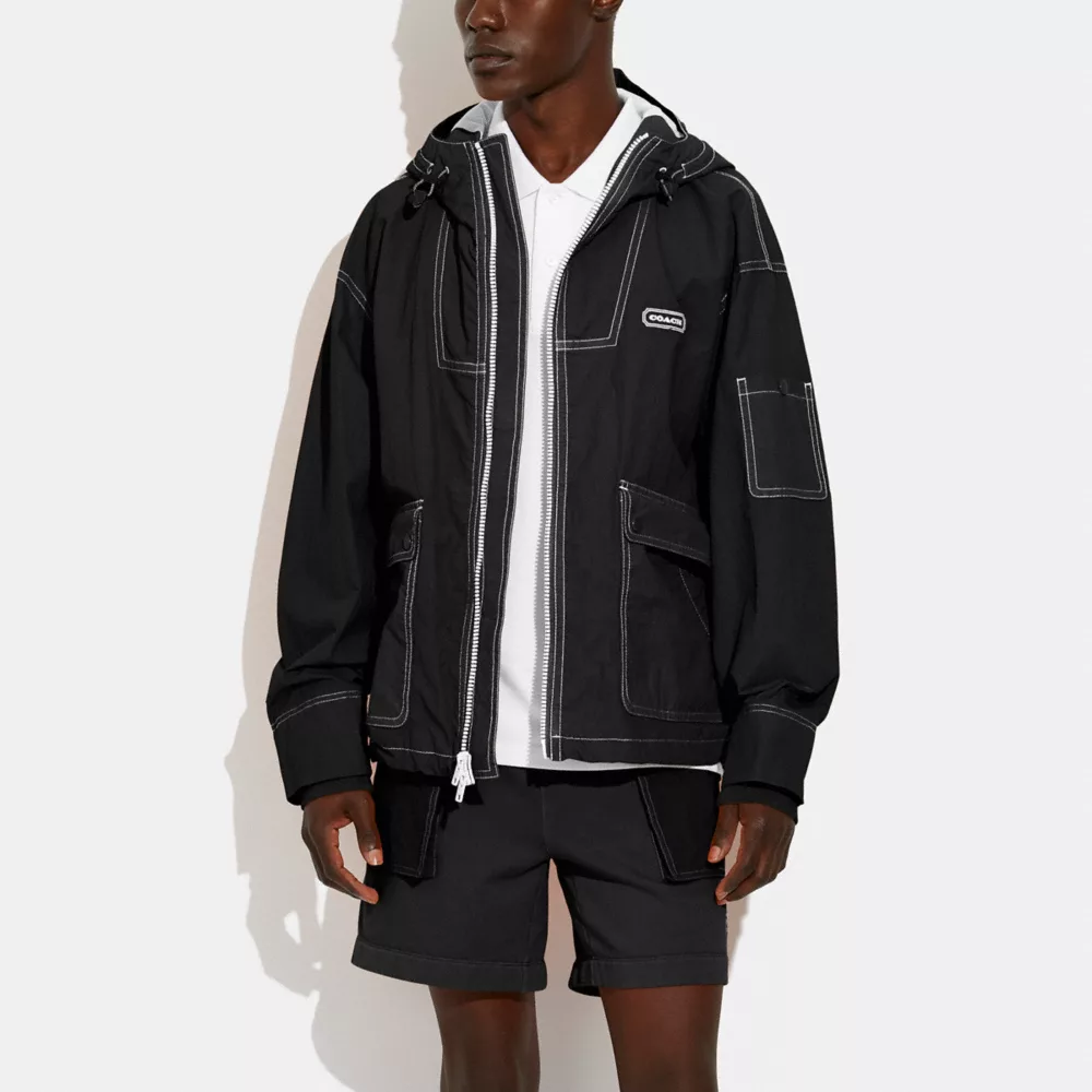 Stand up to wind, rainy days and changeable weather with our perfect lightweight layer. Finished with our Coach Badge, the sporty windbreaker features a protective hood, high stand collar and roomy pockets to hold your keys, phone or wallet.