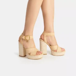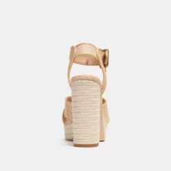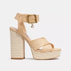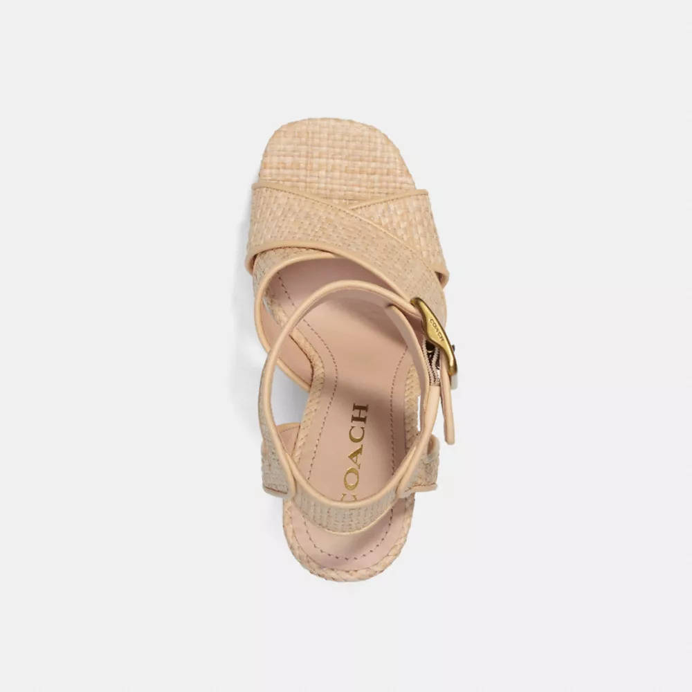 Designed with a polished buckle closure and our dangling Signature charm, the Nelly sandal is a dramatic choice for day or night. Crafted of woven raffia and smooth leather, it features crisscross straps and is finished with an elevated platform and a sturdy block heel detailed with braided jute trim.