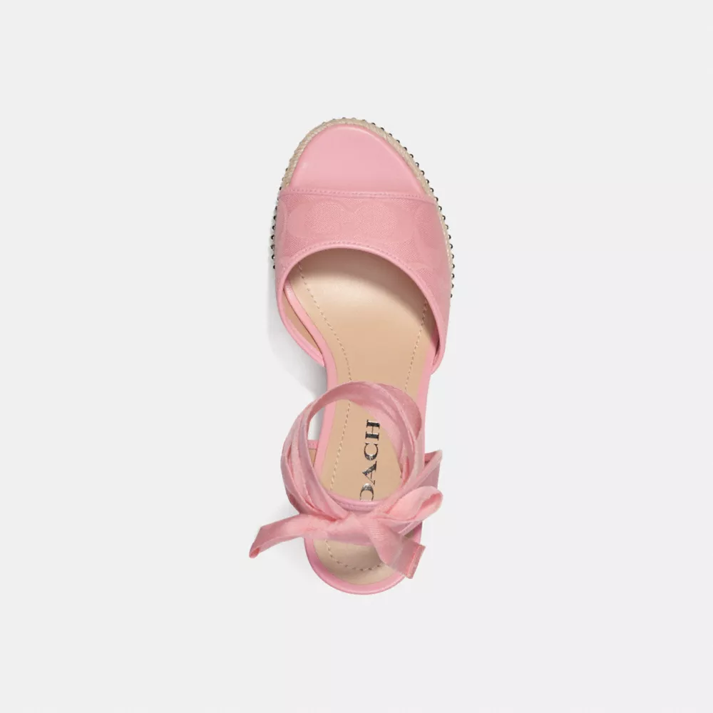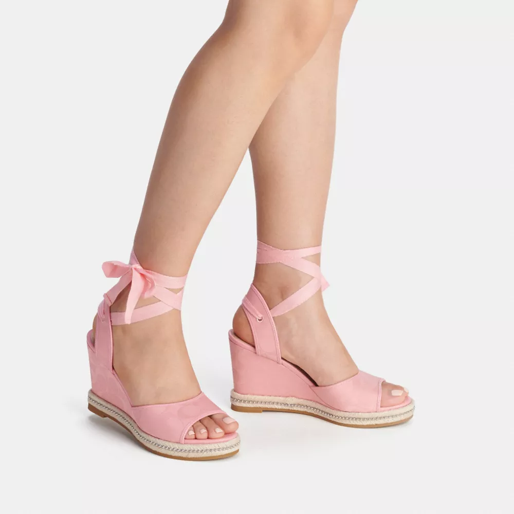 Inspired by our commitment to rethinking and reducing our impact on the planet, this Page wedge is crafted of recycled Signature jacquard made up of 100% recycled poly yarns. The open-toe espadrille-inspired style is finished with ankle wrap ties and a braided platform detailed with gleaming beadchain trim for an added touch of shine.