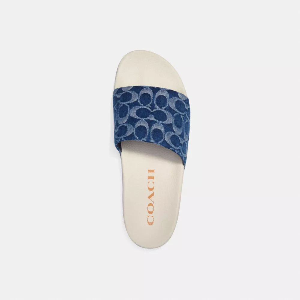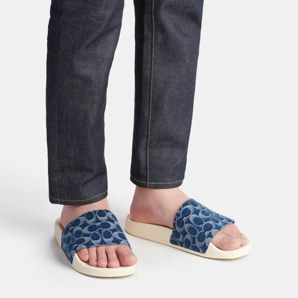 This sporty Signature denim slide is crafted of certified organic cotton made without the use of harmful chemical fertilizers and pesticides, inspired by our commitment to rethinking and reducing our impact on the planet. The contoured footbed and rubber sole offer great traction on city streets and poolside.