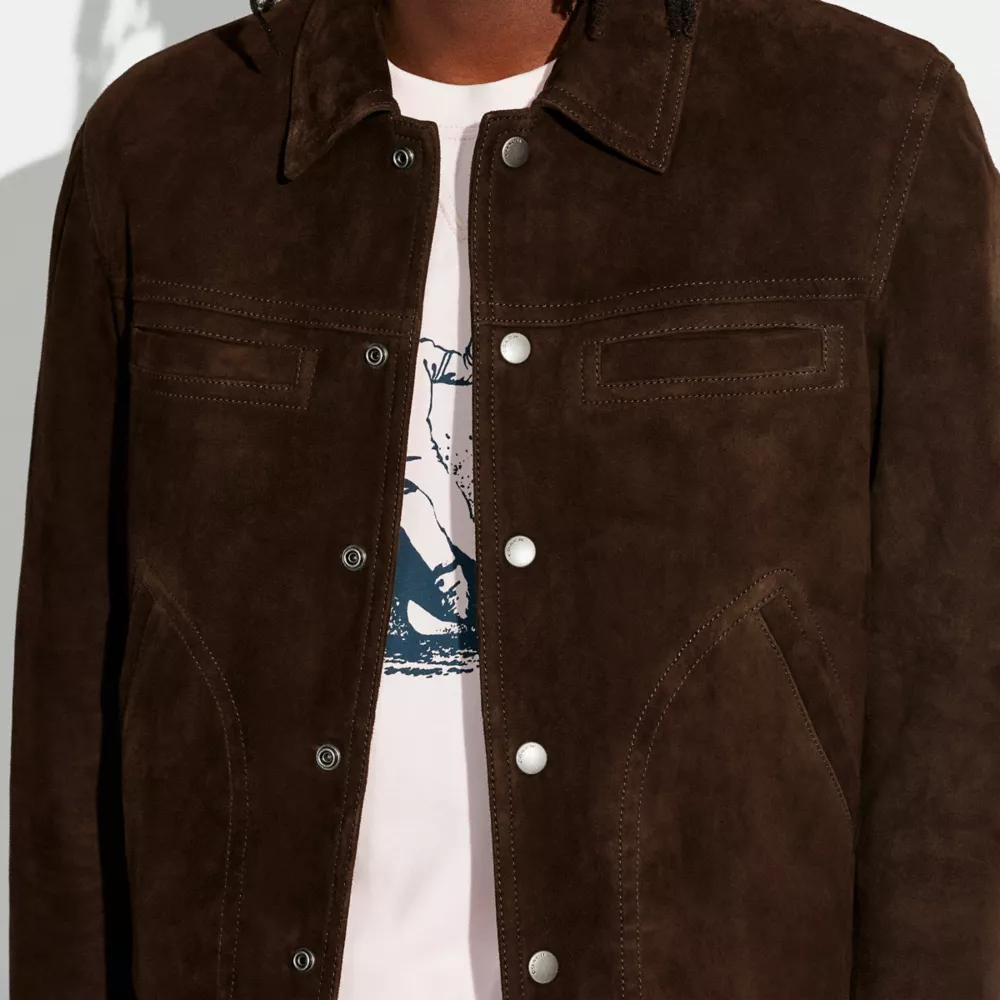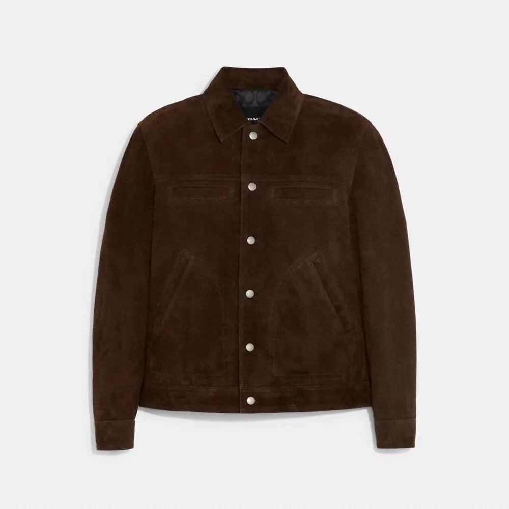 Smooth moves, this classic snap-front jacket is crafted of velvety soft suede that adds a sophisticated finish to any look. The wardrobe staple features a pointed collar, multiple pockets to hold essentials and is finished with a Signature lining crafted of recycled materials inspired by our commitment to rethinking and reducing our impact on the planet.