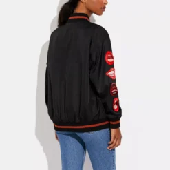 Coach pays homage to legendary New York City artist Tom Wesselmann with this playful, Pop Art-inspired collection. This lightweight Souvenir jacket adds a fun touch to any look with bold, expressive lip patches. The sporty style is finished with our signature striped ribbed trim.